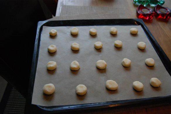 Ta en sked och ta upp en ”klutt” deg och forma till en boll – ca 2cm i diameter. (Använd inget extra mjöl). Platta till den något. Grädda i mitten av ugnen i 20 minuter.