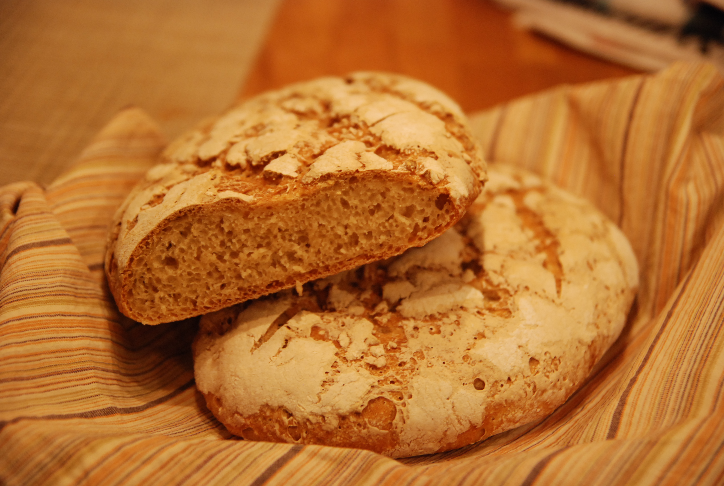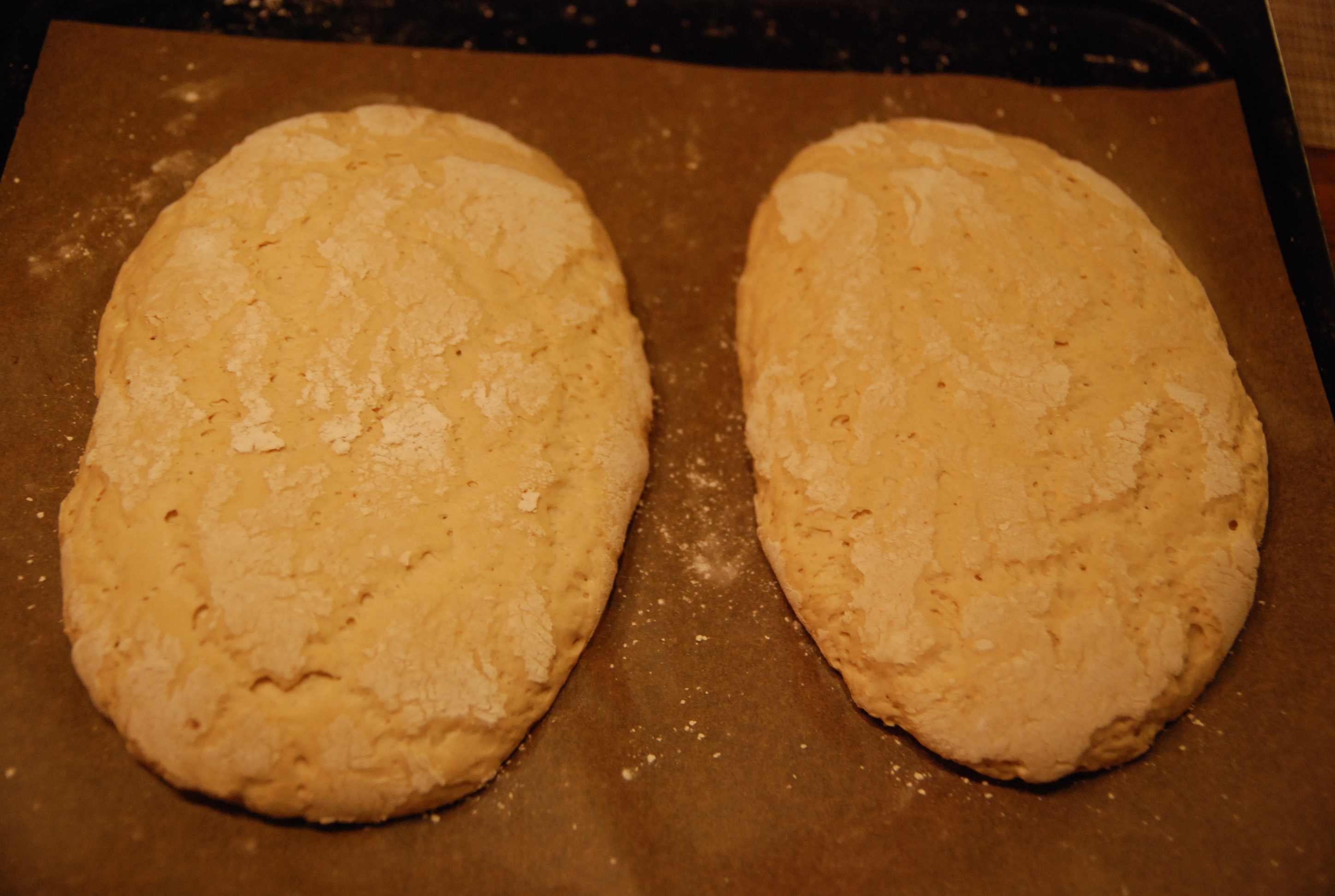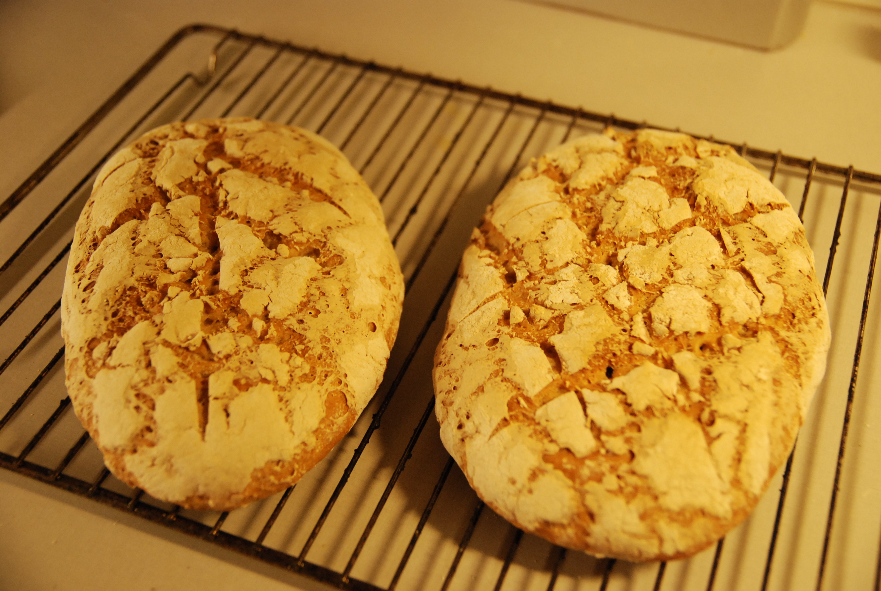 Ta upp degen på väl mjölmixat bakbord. Forma till bröd och lägg på plåtar med bakplåtspapper på (eller om du har jäskorgar – mjöla dem noga och häll degen i dem.) Jäs i 90 minuter. Om du har bröden i korgar – stjälp upp försiktigt. Annars är det bara att försiktigt snitta dem och sätta in plåten i ugnen.