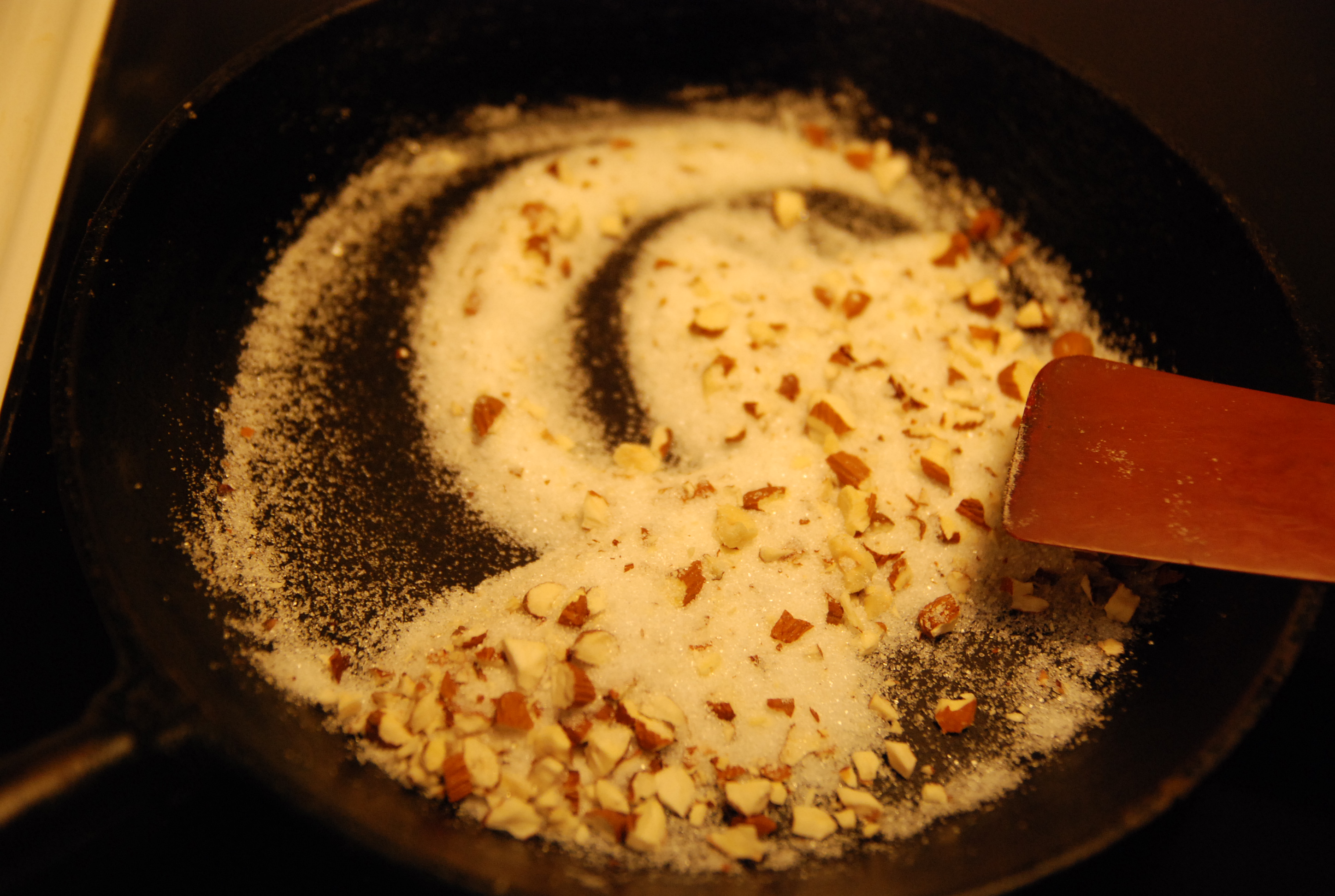 Smält sockret med mandeln till nougaten i stekpanna. Rör hela tiden försiktigt.