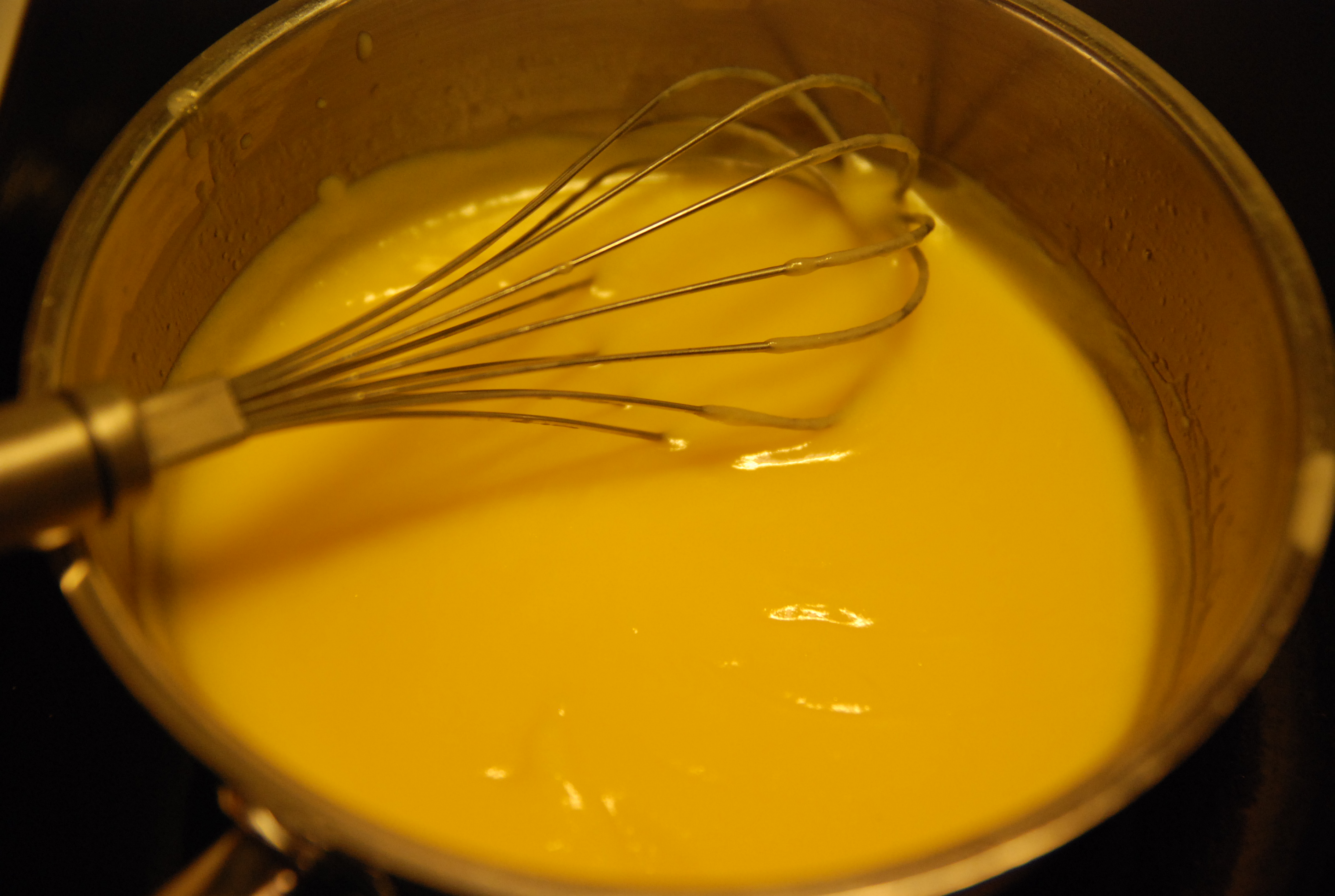 Blanda äggulor, den valda gräddersättningen, socker och det mjökfria margarinet i en tjockbottand kastrull. Låt massan sjuda under konstant försiktig vispning på medeltemperatur tills den tjocknat. (Om smeten skär sig, tillsätt lite kokande vatten.)