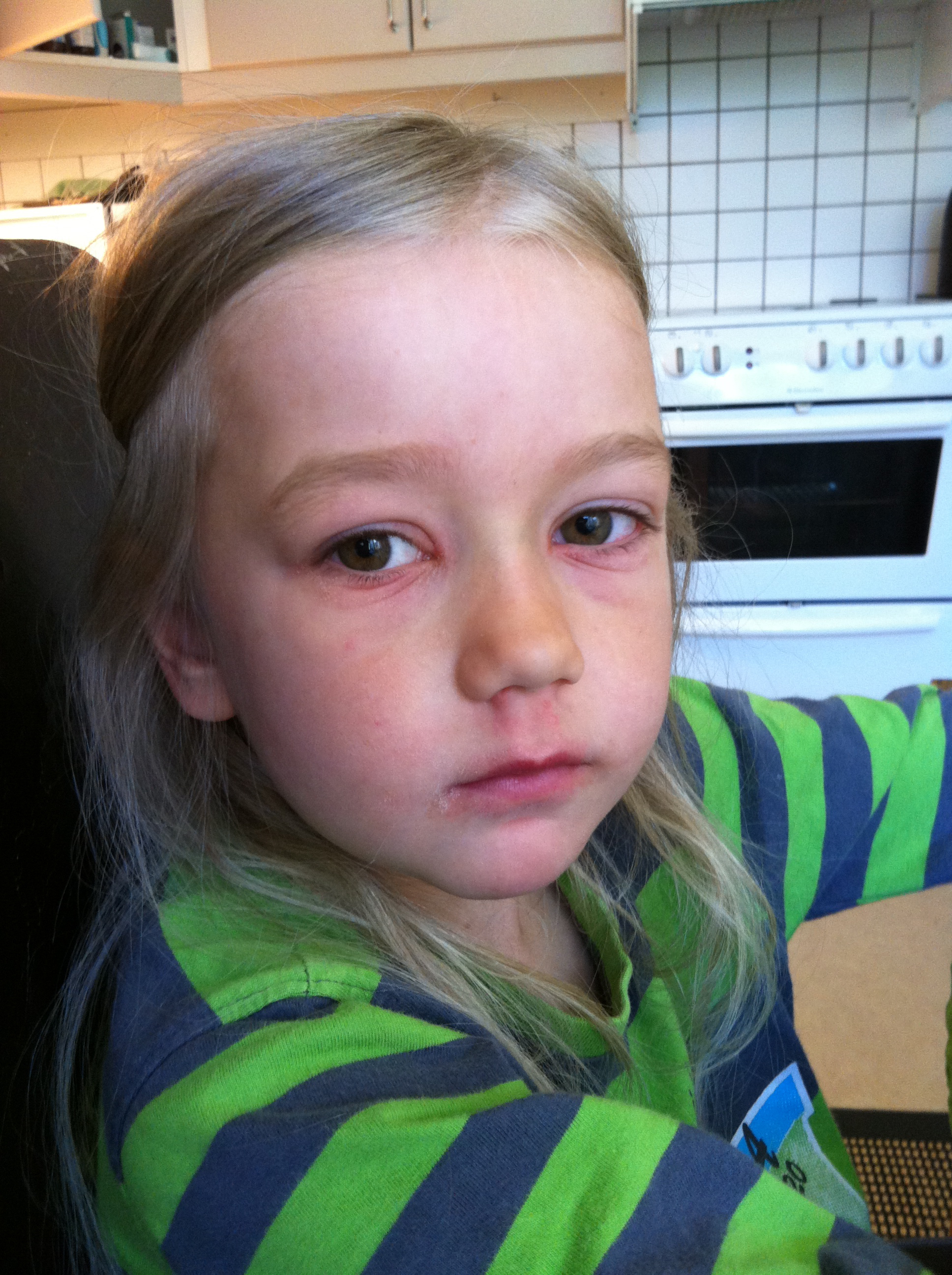En lättnades suck. Men ungefär då började vår minsta – som är en 6-årig tjej få mer och mer problem med sina allergier. Hon utvecklade tidigt i treårsåldern, pollenallergi – först för björk, sedan för gräs och gråbo. Precis som storebror tål hon inte mjölk, vete, råg eller soja (soja ska provas igen i vår). Men sedan i våras har hon dessutom fått en ganska aggressiv utveckling av korsallergier – en del lindriga och en del väldigt besvärliga. Hon får allt från lindrig klåda i hals och lätta utslag till en helt uppsvullen kropp täckt av kliande eksem, svullen hals, astma, riktigt svåra smärtor från magen, rejäl förstoppning .