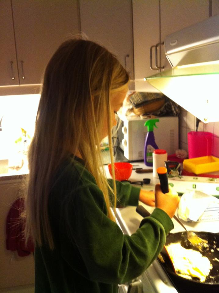Nästan varje frukost lagar Sigrid sin egen omelett – innan hon tar på sig kläder för att sedan avnjuta den före skolgång. Behöver ingen hjälp längre – bara att vi är i köket.