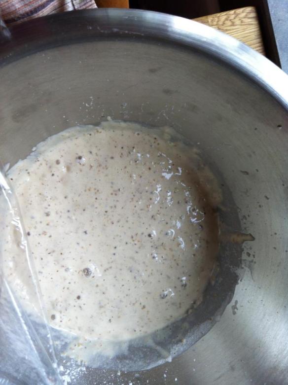 Så såg surdegsblandningen efter ca en timme efter första momentet – inte så mycket ut för världen – men oj vad den hade jäskraft i sig. Efter andra momentet (det nedan) stack surdegen så mycket att den var nära att pösa över kanten. Ta en stor bytta!