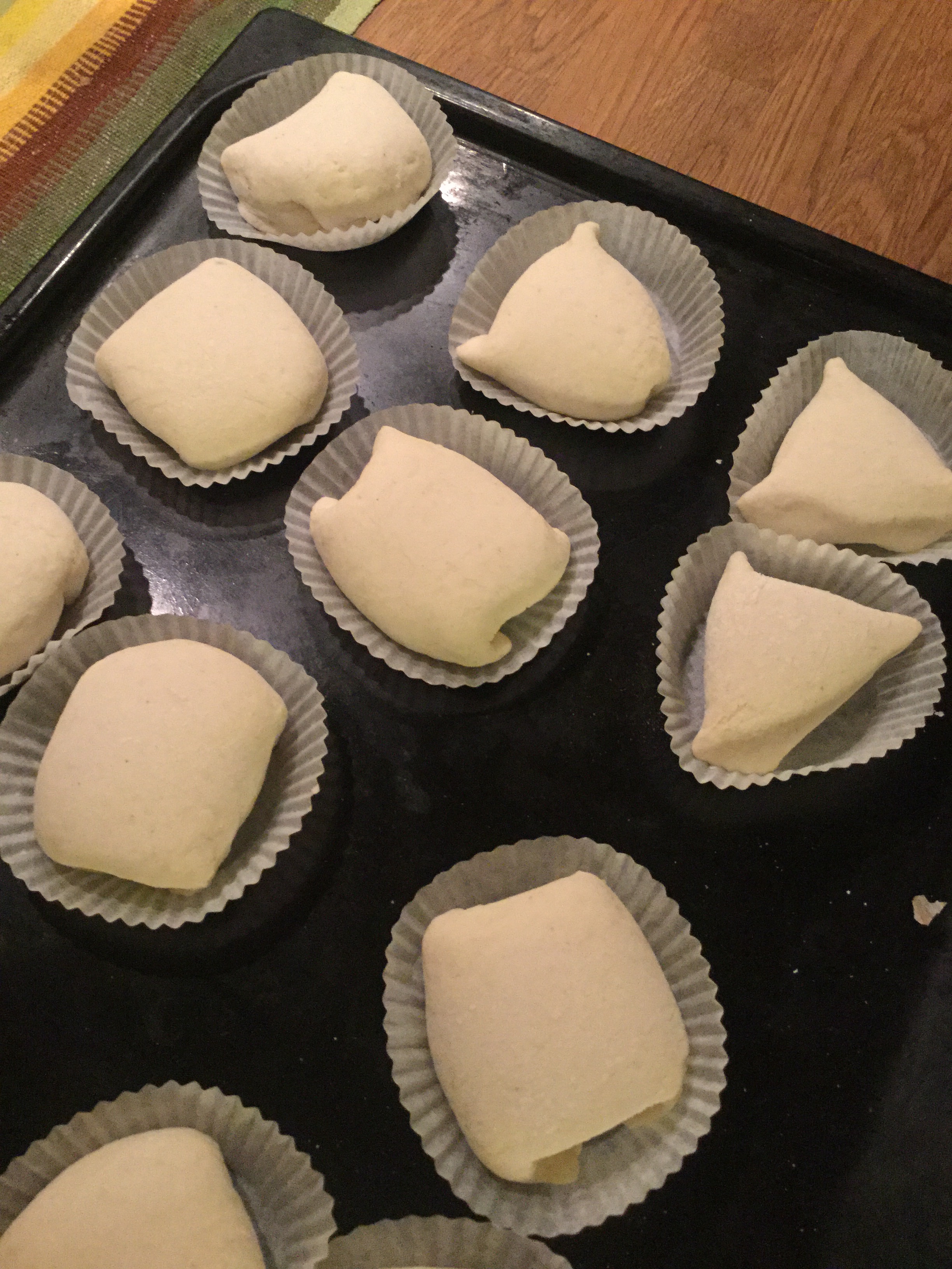 Smörj 30-40 formar med mjölkfritt margarin. Tryck ut degen i formarna. För att göra dem lite mindre porösa penslade jag på lite ägg, kan uteslutas, särskilt om man använder hårt mjölkfritt margarin.