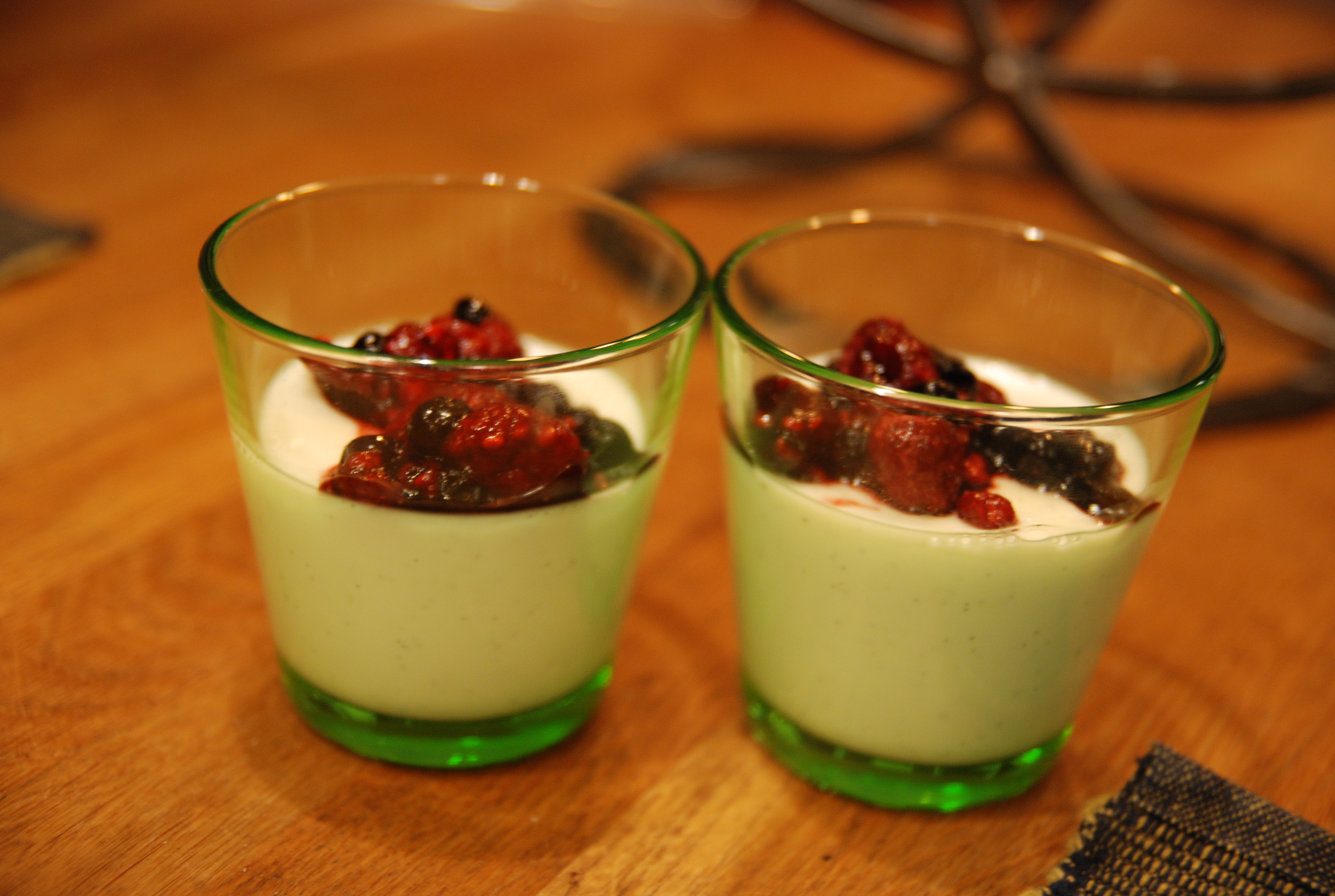 Dela vaniljstången och skrapa i kärnorna i en kastrull. Blanda i de övriga ingredienserna och vispa ihop för hand. Låt blandningen sjuda, samtidigt som du vispar, tills krämen tjocknar. Se till att krämen inte kokar eller bränns vid. Låt den sedan svalna.