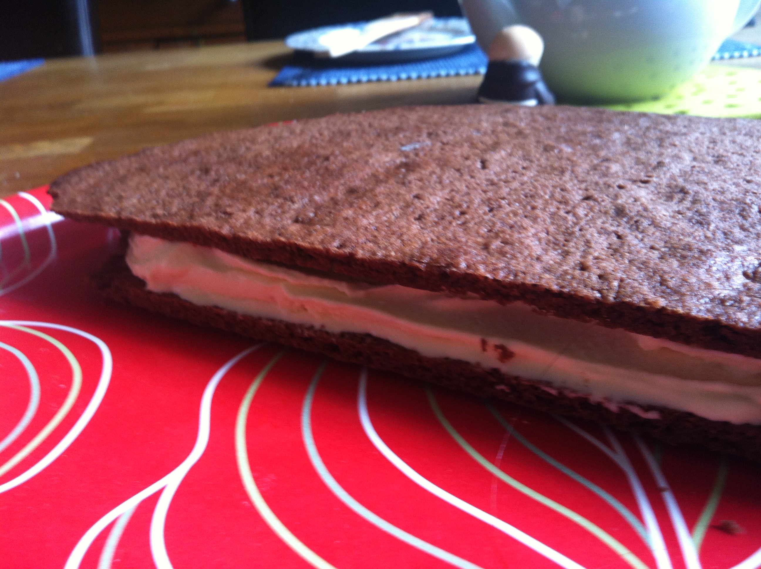 Låt kakan vila lite innan du skär den. Tänk på att du ska få plats med två delningar – börja inte i mitten utan tänk i tredjedelar. Vass kniv och försiktiga rörelser så får du tre fina delar – botten, mitten och taket.